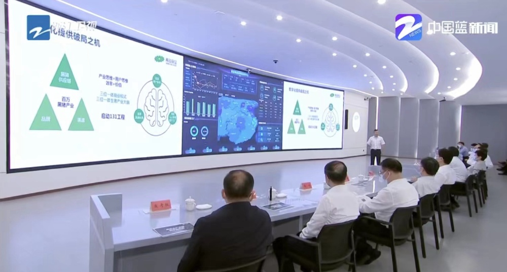 青蓮食品董事長許明曙向袁書記詳細匯報了青蓮整體發(fā)展,重點介紹了以數(shù)字賦能打造生豬全產(chǎn)業(yè)鏈,建設數(shù)字戰(zhàn)略指揮中心,自建數(shù)字化渠道,從產(chǎn)品形成到消費全過程直接擁抱客戶。在青蓮云上牧場方面,與浙江大學合作建立中國首個黑豬產(chǎn)業(yè)研究院,從黑豬營養(yǎng)到育種,借助大數(shù)據(jù)建立起柔性協(xié)同生產(chǎn)體系;